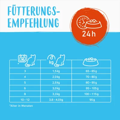 Die angegebenen Futtermengen sind Richtwerte und sollten den individuellen Bedürfnissen angepasst werden, fragen Sie im Zweifel Ihren Tierarzt. Katzenwelpen regelmässig wiegen. Stets frisches Trinkwasser bereitstellen. Kühl, trocken und vor Sonnenlicht geschützt lagern.